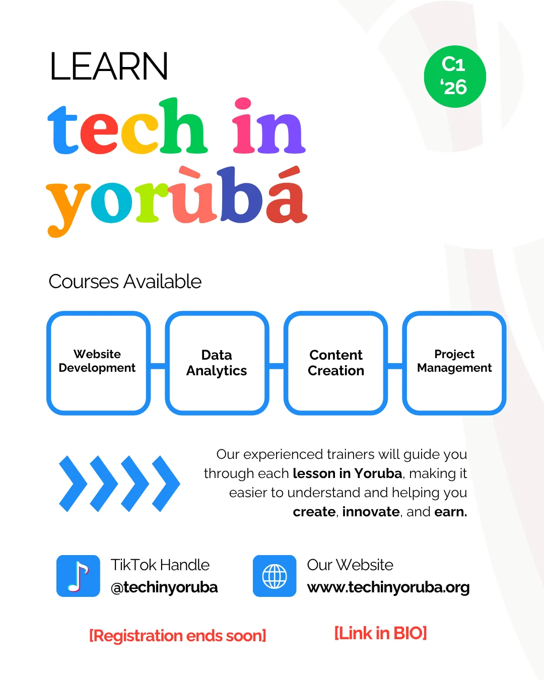 Tech in Yoruba Cohorts are structured, group-based tech training programs designed to help Yoruba-speaking learners gain practical, job-ready skills in tech — all taught in simple, relatable Yoruba language. By...